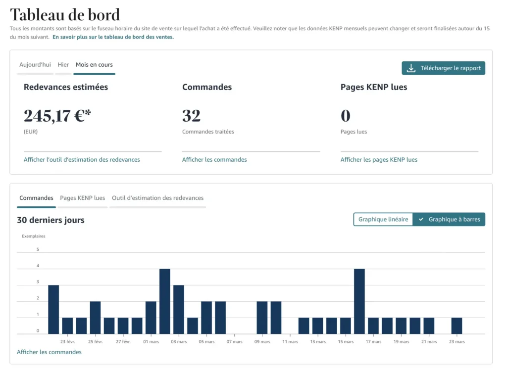 Aujourd’hui, il génère environ 500 visiteurs par mois de manière automatique, ainsi que près de 300€ de ventes de livres mensuelles.